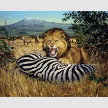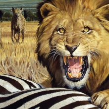 Kilimanjaro Lion & Spotted Hyenas. ‘Defending the Prey’ 97 x 122cm (38 x 48in)