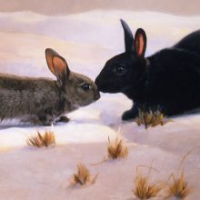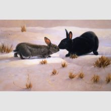 This scene happened to be outside my studio window. A black rabbit appeared from nowhere and approached the resident grey wild rabbit. Wild rabbits occasionally vary in colour and 10 miles from me is an area know for it’s black wild rabbits.